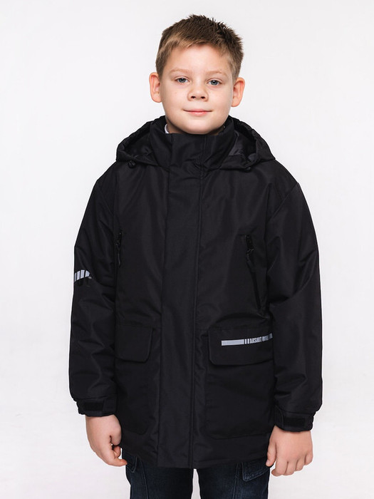 Удлиненная куртка из однотонной мембранной ткани с лаконичной черной фурнитурой. Удобная длина, скрывающая школьный пиджак. На куртке четыре кармана, два нагрудных на молниях и два объемных нижних кармана с клапанами. Внутренний накладной карман на ленте «велькро». Фронтальная молния под ветрозащитной планкой. Ветрозащитная планка фиксируется потайными кнопками. Низ рукавов дополнен манжетами на эластичной тесьме и патами с лентой «велькро». Тонкий несъемный капюшон заправляется в стойку вороника. Регулировка лицевой части капюшона выполнена с помощью кулисы со шнуром. На клапане левого кармана термопринт черного цвета. На правом рукаве светоотражающий термопринт в сочетании с черным цветом.Характеристики:Ткань верха: Liverpool WR membraneПодклад: полибушет / п/э