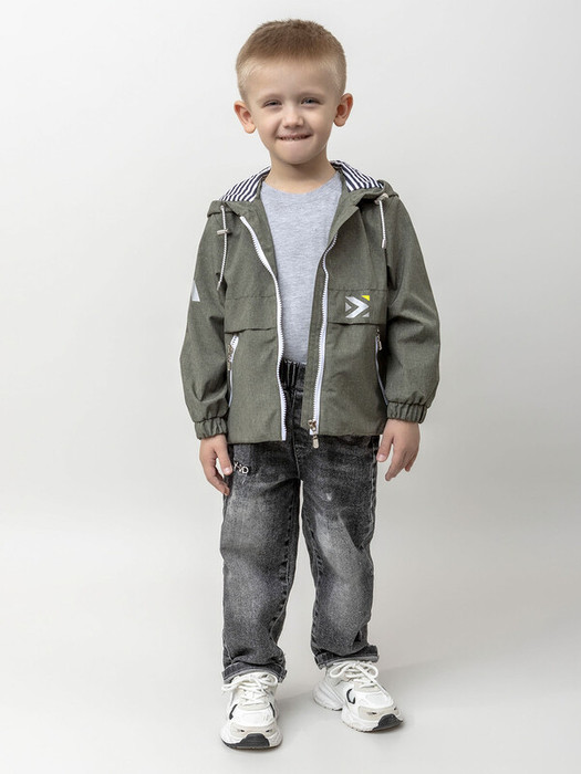 Стильная ветровка для мальчиков. Ткань – меланж, ламинированная с внутренней стороны. Подкладка трикотаж-интерлок (хлопок 100%). На спинке и полочке декоративная склада. Фронтальная застежка-молния с внутренней ветрозащитной планкой. Боковые карманы на молниях. Молнии белого цвета. Манжеты рукавов обработаны эластичной тесьмой. Капюшон несъемный. Регулировка по лицевой части капюшона выполнена с помощью кулисы со шнуром-резинкой и фиксаторами. Эффектно дополняет модель светоотражающий термопринт на правом рукаве, левой полочке и спинке ветровки.Характеристики:Ткань верха: Амур TPU 3000Подклад: трикотаж-полоска хл / пэ