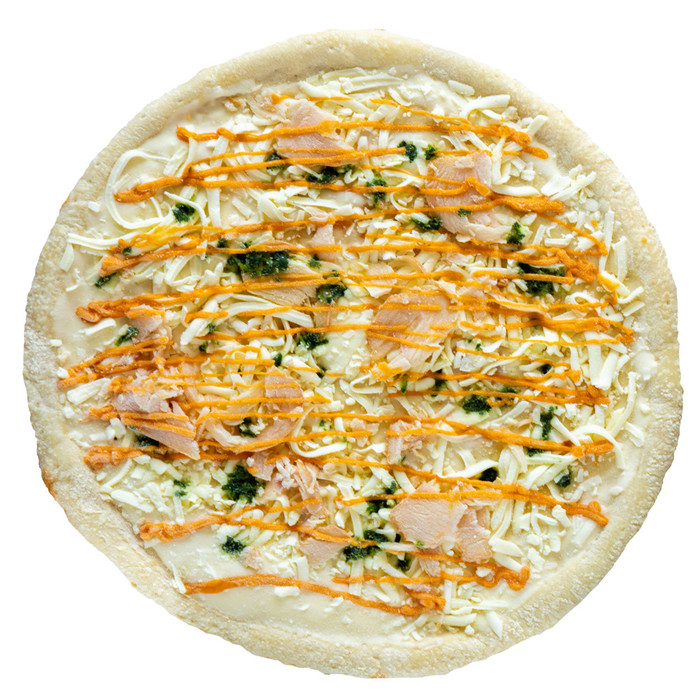 Состав: курица копченая, сыр моцарелла, соус сливочный, масло песто, основа пшеничная.