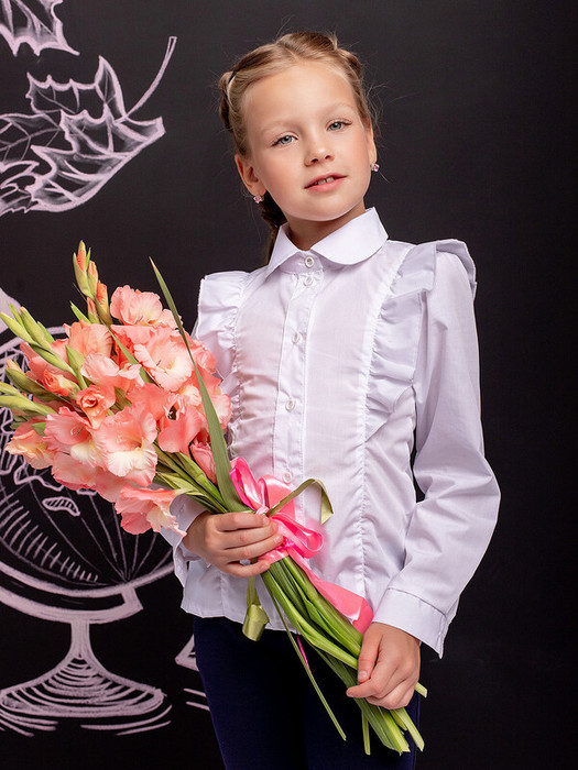 Блузка белая для девочки с длинными рукавами и декоративными оборками. Застежка на петли пуговицы. Модная блузка с отложным воротником обеспечит школьнице полный комфорт во время уроков и на перемене.Характеристики:Ткань:Сорочечная ткань (хлопок 97%, спандекс 3%) Производитель: batik