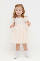 Нарядное платье с пышной юбкой и рюшами из фатина, с декоративным бантом на поясе сзади. На спинке имеется поясок чтобы дополнительно утянуть талию. Подкладка 100% хлопок.