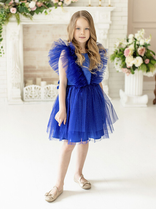 Нарядное синее платье с пышной многослойной юбкой из фатина. Объемные рукава, бант сзади, блестки. Подкладка 100% хлопок. Характеристики:Размеры (рост): 98-134Ткань верха: Сатин - Полиэстер Сетка - ПолиэстерПодкладка 100% хлопокПроизводитель: batik