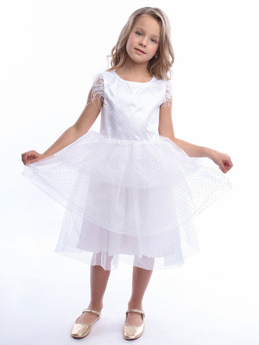 Нарядное пышное платье белого цвета с перьями на рукавах. Удобное и невероятно красивое платье для утренников и фотосессий. Трехслойная пышная юбка из фатина длиной до колена. Платье выполнено в минималистичном стиле и при этом смотрится празднично. Станет прекрасным дополнением детского праздничного гардероба. На любой вечеринке ваша модница будет в центре внимания.Характеристики:Размеры (рост): 98-134Ткань верха: Сатин - Полиэстер Сетка - ПолиэстерПодкладка 100% хлопокПроизводитель: batik
