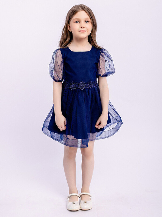 Легкое платье из хлопка с юбкой из трикотажной сетки. Короткие рукава-фонарики из полупрозрачной ткани. Квадратный вырез горловины. Пояс украшен цветочными аппликациями. Ткань верха 100% хлопок, сетка 100% полиэстер. Характеристики:Ткань верха: 100% хлопок Сетка - ПолиэстерПодклад 100% хлопокПроизводитель: batik
