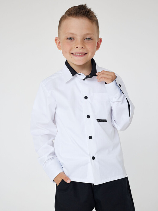 Приталенная рубашка белого цвета для мальчика с длинным рукавом, нагрудным карманом и контрастной отделкой. Застежка на пуговицы. Нашивка на кармане. Характеристики:Ткань:Сорочечная ткань 60%хлопок, 40%полиэстерПроизводитель: Batik