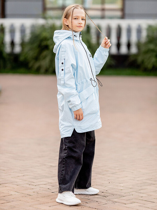 Ветровка-пыльник для девочки Джун из коллекции Весна-2023 с капюшоном нежно-голубая представляет собой демисезонную удлиненную парку из курточной ткани с водоотталкивающей пропиткой. Застегивается на центральную молнию с защитой подбородка на воротнике. На груди небольшая надпись. Слегка удлиненная спинка, разрезы по бокам.   Особенности:  Регулируемый капюшон трансформируется в воротник На рукаве хлястики-утяжки на кнопках  Эластичный низ рукава Регулировка по талии Накладные карманы с клапаном на магните Светоотражающие термотрансферы Характеристики:Ткань верха: Курточная ткань с водоотталкивающей пропиткой Подклад: полиэстер/сеткаУтеплитель: нет Температурный режим: + 8 С (с поддевой), +15 С (без поддевы)Производитель: batik