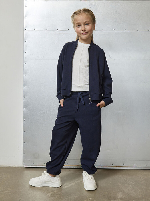 Трикотажные брюки для девочки темно-синие. Пояс на резинке с регулировкой по талии на шнурок. По низу брюк манжеты, боковые карманы.Характеристики:Ткань: хлопок 79%, полиэстер 18%, спандекс 3%Производитель: batik