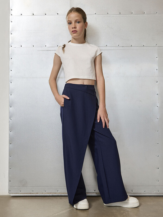 Элегантные брюки-палаццо с асимметричным запахом – тренд сезона. Дерзкий асимметричный крой и высокая посадка подчеркивают талию. Удобная комбинированная посадка – эластичная резинка сзади и стильный декоративный гульфик спереди. Свободные летящие штанины визуально удлиняют ноги, сохраняя максимальный комфорт. Практичные боковые карманы для необходимых мелочей. Универсальный синий цвет легко сочетается с любыми верхами – от облегающих топов до объемных свитеров. Идеальная модель для создания эффектных образов.Характеристики:Ткань: хлопок 60%, полиэстер 40%Производитель: batik