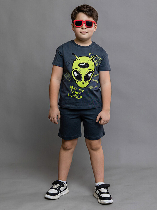 Комплект (футболка + шорты) для мальчика трикотажный из супрема пенье в цвете графит. Футболка с коротким рукавом и принтом в инопланетном стиле. Приятная на ощупь дышащая ткань комплекта не потеряет свой первоначальный вид после множества стирок.Характеристики:Ткань: супрем пенье 92% хлопок 8% эластан/ ткацкое полотноПроизводитель: batik