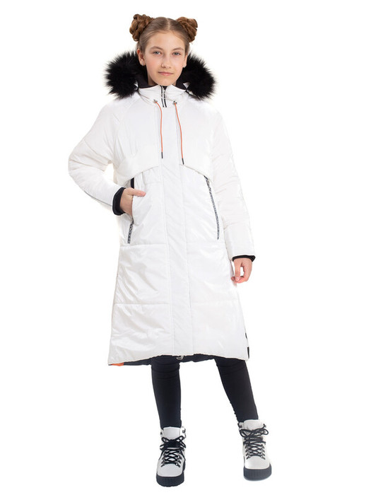 Пальто зимнее для девочки Глория утепленное от batik - красивая модель в стиле спорт-шик. Низ фигурный, по спине удлинение. Перламутровая ткань в цвете белый жемчуг смотрится невероятно стильно. Опушка капюшона выполнена в контрастном черном цвете, ее можно отстегнуть.   Особенности: Регулировка объема и глубины капюшонаТрикотажная резинка по краю капюшонаЗастежка-молния с ветрозащитной планкой и защитой подбородкаБоковые карманы на молнииГладкий подклад в рукавеСветоотражатели для безопасности в темное время сутокЭластичные трикотажные манжетыБретели свободные рукиРегулировка по талииБоковые разрезы на молнияхДекор в виде ч/б надписей на карманах, капюшоне, нашивокХарактеристики:Материал верха: Nylon perlПодклад: POLAR FLEECE / TaffetaУтеплитель: слайтекс 300Опушка: искусственнаяТемпературный режим: от 0 до -35 СРазмеры: 140-170Производитель: batik