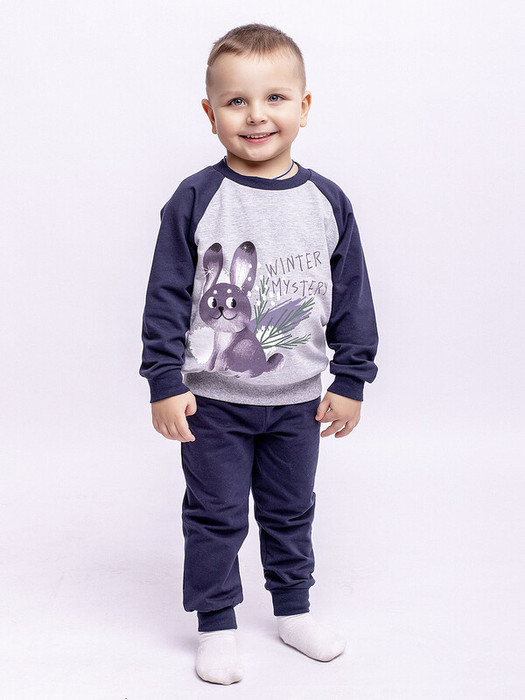 Пижама детская серо-синяя: пуловер и брюки. Новогодний рисунок с зайчиком и надписью.Особенности:Пуловер с длинным рукавом и эластичными манжетамиПринт на пуловере спередиБрюки на резинке со шнуркомХарактеристики:Материал: 95% хлопок, 5% эластан (футер 2х нитка с начесом)Размеры: 98-140Производитель: batik