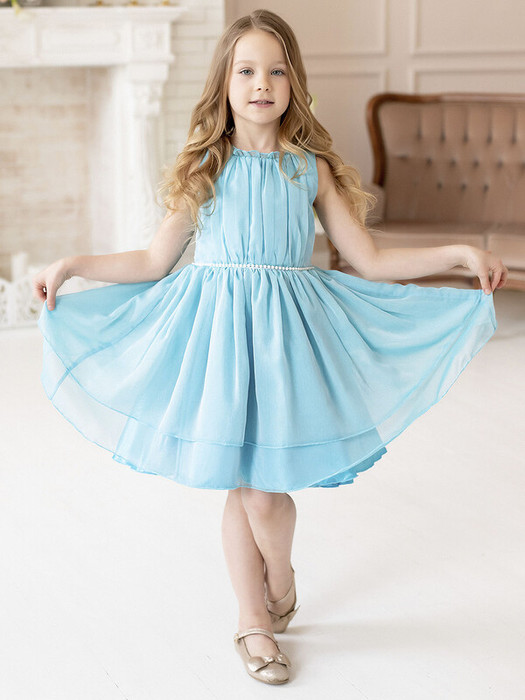 Нарядное голубое платье в романтичном стиле без рукавов. Поясок из бусин. Подкладка 100% хлопок. Характеристики:Размеры (рост): 98-134Ткань верха: Сатин - Полиэстер Сетка - ПолиэстерПодкладка 100% хлопокПроизводитель: batik