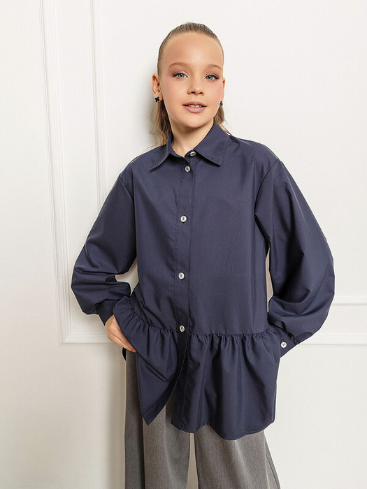 Темно-синяя широкая рубашка с романтичной оборкой. Объемный силуэт – свободный крой для комфорта и модного oversize-эффекта. Очаровательная оборка по подолу – акцент, создающий воздушный образ. Классический отложной воротник подчеркивает аккуратность и стиль. Длинные рукава – универсальный вариант для любого сезона. Застежка на пуговицах. Идеальная база для школьного и праздничного гардероба. Качественный материал – приятный к телу, хорошо держит форму. Универсальность – сочетается с юбками, шортами, джинсами и сарафанами.Характеристики:Ткань: хлопок 60%, полиэстер 40%Производитель: batik