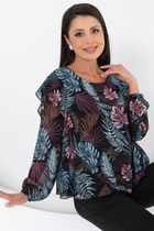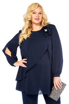 Блузка прямого силуэта из нежнейше ткани прямого силуэта. По полочке по горловине обработаны складки для объёма и фигурная капелька. Воротник стойка перекрученный в элегантный узел по полочке. Спинка со средним швом, в котором вставлена потайная застежка молния, входящая в стойку для удобства. Рукав длинный по окату небольшая сборка, по низу рукав присборен и обработан притачной манжетой, застёгивающийся на петлю и пуговицу.