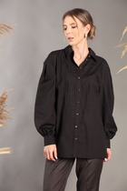 Рукава втачные длинные, свободного объема, на широкой эластичной манжете с воланом. Линия низа асимметрична. Спинка слегка удлинена относительно переда, закругленной формы, дополнена небольшими разрезами в боковых швах. Прекрасно сочетается с брюками и юбками. При съемке в образе использованы брюки женские бренда Анелли - 1296.
