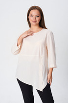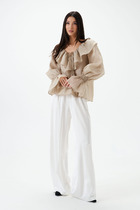 Блуза прямого кроя с крупным воротников выполнена из полотна бежевого цвета.Характеристики: прямой крой, V образный вырез горловины, по периметру горловины и по спинке крупный воротник выполнен из ткани основного изделия, рукав втачной, в области запястья по рукаву широкая венгерка, спинка цельнокроеная. Длина по спинке 56, длина рукава 71 см.