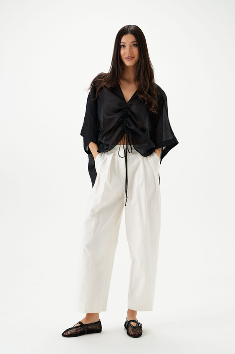 Блуза свободного кроя. Выполнена из лёгкого натурального полотна рами. Вырез горловины V-образный. По переду регулируемая кулиска. Рукав цельнокроеный. Длина рукава от горловины 46 см. Длина спинки 72 см