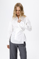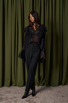 Блужка свободного кроя, выполнена из легкой, прозрачной ткани черного цвета. Характеристика: прямой крой, воротник стойка, застежка на петли пуговицы и шнурки-завязки. Рюша нашита по переду и на спинке изделия. Рукав втачной свободного кроя, по низу пришита рюша, которая фиксируется шурками-завязками. Длина спинки 60см, длина рукава от края горловины 77см.
