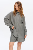 Блузон женский прямого силуэта, выполнен из легкого полотна черного цвета. Характеристики: горловина круглая, по спинке с разрезом, застегивающимся на петлю-пуговицу, укороченный спереди и длинный по спинке. Длина по спинке 137 см, длина по переду 35 см