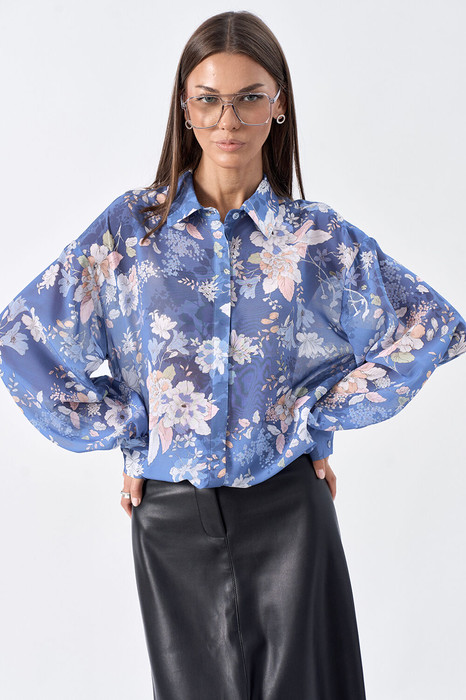 Шифоновая блузка с геометричным принтом свободного силуэта. Рукав длинный, втачной с манжетой. Воротник -отложной. Возможно отличие фотографии по оттенку, связанное с разной цветопередачей монитора.