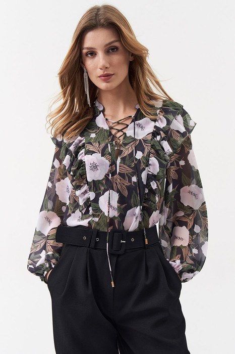 Шифоновая блузка с нежным цветочным принтом свободного силуэта. на переде и спинке обработаны вертикальные рельефы с романтичной оборкой. Рукав длинный, втачной, присборен на эластичную тесьму. Горловина V-образной формы, воротник -стойка. Возможно отличие фотографии по оттенку, связанное с разной цветопередачей монитора.
