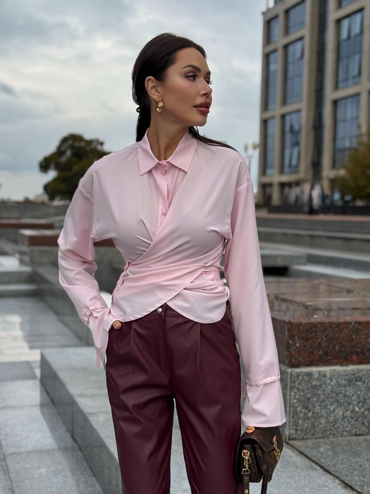 Блуза прямого силуэта с классическим воротником. Застёжка- планка с пуговицами. Плечевой шов спущен. Рукав обработан широкой манжетой, ширина манжеты регулируется шнурком из основном ткани. В комплекте есть деталь для фантазийного способа носки блузы, когда низ блузы перекрещивается внахлест и застегивается планкой, идущей в комлекте. Такой способ делает основной акцент на талии. Планка съёмнаяя. Носить блузу моно в класическом варианте.