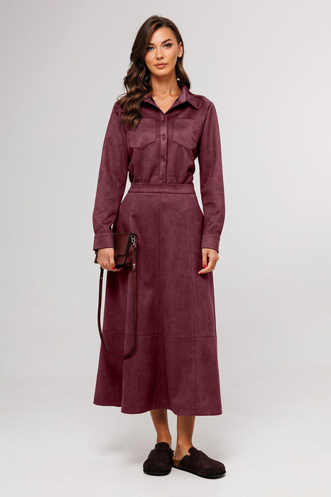 Блузка замшевая прямого силуэта, с втачным одношовным рукавом внизу со складкой и манжетой, с застежкой на петлю-пуговицу. Полочка с центральной застежкой на петли-пуговицы и накладным карманом и горизонтальным подрезом. Синка с кокеткой. Воротник рубашечный отложной на стойке. Внизу по боковым швам обработаны разрезы.