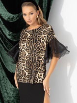 Блузка выполнена из тонкого трикотажного полотна в комбинации с отделочной тканью в пайетки.