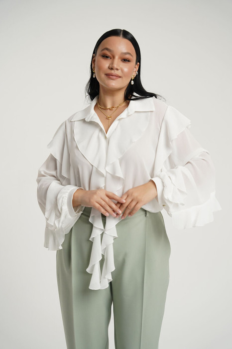 Блузка из шифона прямого силуэта. Воротник рубашечный, по переду отрезные планки с воланами и застежкой на петли и пуговицы. Рукав втачной объемный,  с воланами, вставленными в декоративный подрезы. Низ рукава присборен на манжету с застежкой на пуговицу. В боковых швах разрезы.