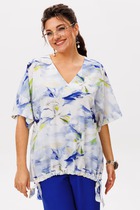 Блузка женская свободного силуэта из легкой плательной ткани. Вырез горловины V-образной формы с воланами. Застежка - завязки. Рукав а- втачные, объемной формы, присборенные внизу на эластичную тесьму.
