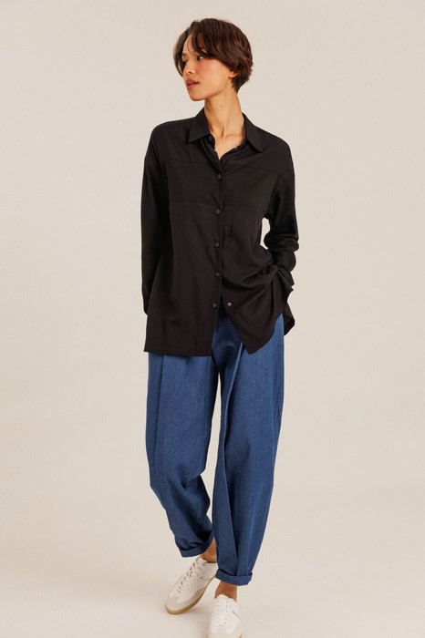 Блузка женская прямого силуэта из ткани блузочного ассортимента. Перед с горизонтальной вставкой из трикотажного полотна в области груди. Спинка цельная прямая, в области выше лопаток настрочена нашивка. По боковым швам обработаны разрезы. Рукава спущенные из трикотажного полотна, подшиты на плоскошевной машине. Край борта обработан подбортом. Воротник отложной на стойке. Застежка на пробивные кнопки.