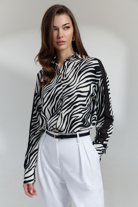 Блузка женская прямого силуэта. Борт обработан цельнокроеными планками. Низ блузки прямой. Рукав втачной, спущенный, с манжетой по низу. По плечевому шву и рукаву имеется декоративная цельнокроеная вставка из шифона. Спинка на кокетке. Застежка на планках и манжетах на пробивные петли и пришивные пуговицы.