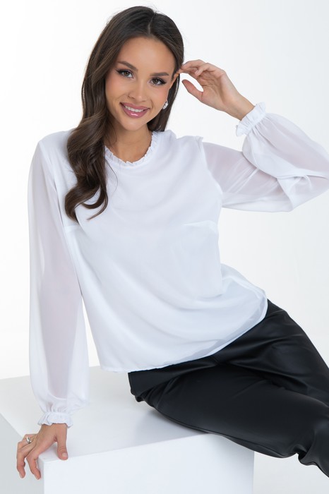 Очаровательная свободная шифоновая блузка, подчеркивающее женственность - отличное решение на каждый день или на праздник для современной стильной женщины. Шикарная модель с объемными длинными рукавами выполнена из высококачественного шифона. Круглая горловина оформлена рюшей с застежкой на пуговицу на спине. Нежная блузка  из шифона на трикотажном подкладе, по переду сделаны вытачки на грудь, рукава втачные, пышные, длинные, снизу собраны на резинку.