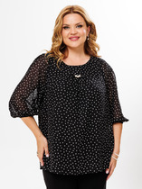 Блузка женская, прямого силуэта длиной до середины бедра. Рукава втачные одношовные, длинные, плечо спущено. На спинке средний шов, в верхней части разрез застегивается на петлю и пуговицу. Перед из ткани с паетками. Горловина обработана кантом.