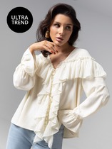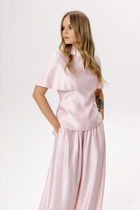Базовая женская рубашка свободного силуэта выполнена из струящейся ткани с содержанием шёлка. Рукава втачные с разрезами немного расширены к низу; воротник рубашечный; по переду функциональные завязки. Рубашка полностью соответствует заявленному размеру. Пожалуйста, пользуйтесь таблицей замеров готового изделия.