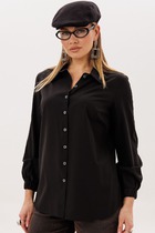 Блузка оригинальная приталенного силуэта из вельветовой ткани. Перед с подрезом под грудью, сборкой в районе груди и талиевыми вытачками. Затсежка на петли и пуговицы. Горловина V-образной формы. Спинка с талиевыми вытачками. Рукав втачной со сборкой по окату и с манжетой по низу. Манжета высокая с двумя петлями и пуговицами. Длина блузки - 63 см, длина рукава блузки - 64 см.