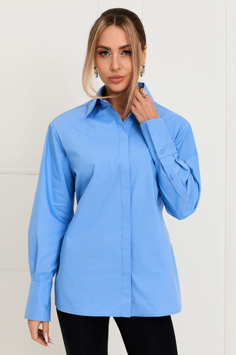 Блузка, с центральной потайной застежкой на петли и пуговицы по планке переда, с втачным воротником с отрезной стойкой. Плечевой шов переходит на перед. По спинке с отрезной кокеткой. Рукав втачной, длинный, с отрезной манжетой. Манжета застегивается на одну петлю и пуговицу. Блузка со съемным пояском. По боковым швам расположены шлевки для пояса.