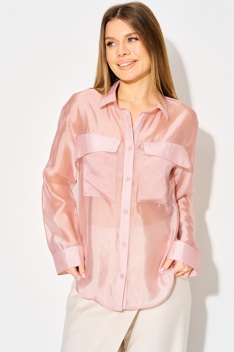 Модель полуприлегающего силуэта длиной ниже линии бедер. Блузка выполнена с изысканным спущенным плечом, что придает ей особую легкость и романтичность. Воротник рубашечного типа, центральная застежка на шесть пуговиц добавляет нотку классики. Детали переда украшены кокетками, а накладные карманы придают блузке современный вид. Спинка с кокеткой и аккуратной складкой по центру, рукава втачные одношовные с манжетами и застежками на пуговицы.