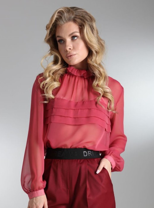 Элегантная блуза из легкой полупрозрачной ткани свободного силуэта. По переду блузки добавлен оригинальный элемент в виде складок, который служит декором, а также скрывает полупрозрачность блузы.