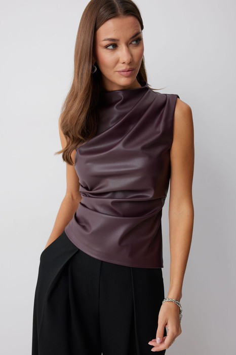 Блуза прилегающего силуэта из экокожи с ассиметричным низом. Горловина с цельнокроеной стойкой. По переду декоративные складки, выходящие из плеча и бокового шва. На спинке в центральном шве потайная молния и талиевые вытачки.