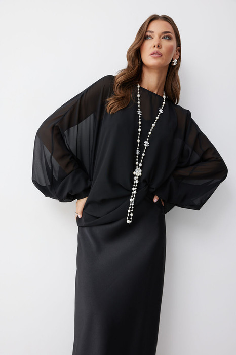 Блуза из шифона. Свободного, расширенного силуэта, с широким цельнокроеным рукавом со сборкой по нижнему срезу. Рукав с манжетой, манжета с застежкой на петлю с пуговицей. Горловина овальной формы. Застежка по среднему шву спинки на петлю с пуговицей. Нижняя блуза из струящейся ткани. Силуэт прямой, свободный. С глубоким V- образным вырезом горловины по переду. С нагрудными вытачками.