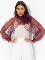 Роскошная блузка полуприлегающего силуэта из текстильной ткани зеленого цвета. Фигурный вырез и перед изделия дополнены широкой оборкой с декоративным элементом в форме цветка. Втачные рукава дополнены оборкой. Длина изделия по спинке от плечевого шва до низа изделия - 63 см. Рост фотомодели - 170 см