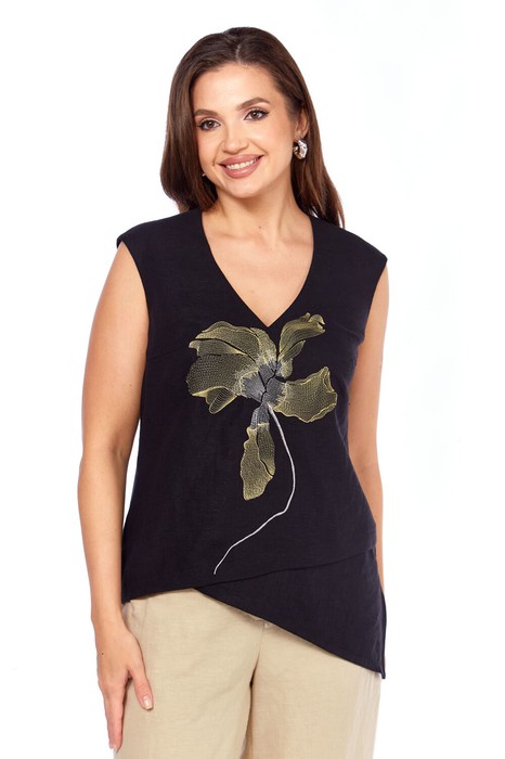 Блуза прямого силуэта. По переду нагрудные вытачки от боковых швов, декоративная вышивка. Низ ассиметричный с отрезной деталью. разрез в левом боковом шве. Плечо слегка спущено. Горловина с V- образным вырезом.