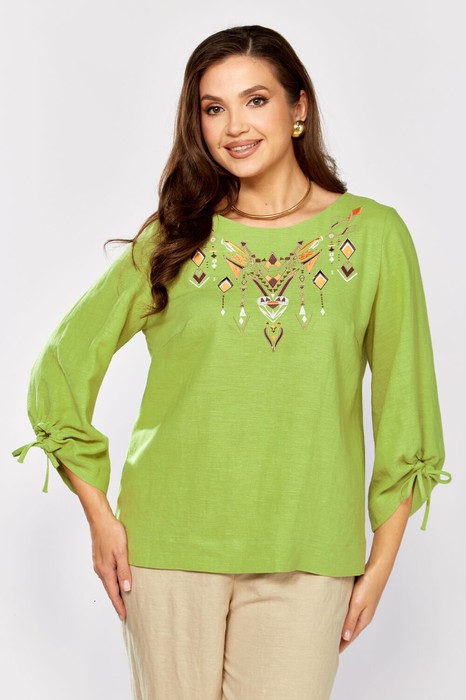 Блуза полуприлегающего силуэта. В боковых швах разрезы . Низ разноуровневый. По переду нагрудные вытачки и декоративная вышивка. Рукав втачной, расширен к низу. В нижней части декоративный элемент с кулисой, завязки выполнены из основной ткани . Горловина "лодочка".