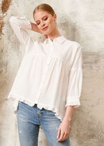 Блуза женская, рукав втачной со сборкой по окату. Рукав расширяется к низу. V-образный вырез с двойным воланом. Низ рукава обработан манжетой на венгерке. В комплекте топ хлопка(100%) на регулируемых бретелях.