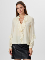 Блуза женская, рукав втачной со сборкой по окату. Рукав расширяется к низу. V-образный вырез с двойным воланом. Низ рукава обработан манжетой на венгерке. В комплекте топ хлопка(100%) на регулируемых бретелях.