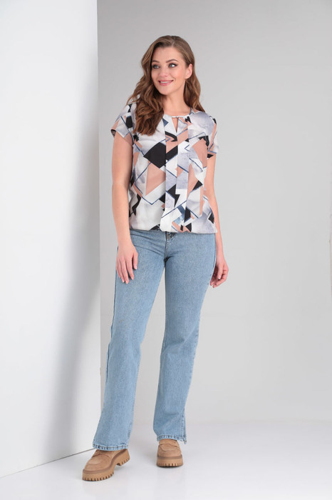 Стильная женская блуза прямого силуэта. Перед стачной, по центру с двумя отлетными планками, с V-образным вырезом по горловине. Горловина окантована. Спереди по горловине протянута в окантовку отделочная деталь. Спинка с разрезом сверху горловины с окантовкой разреза и застёжкой на пуговицу. Рукав короткий, фигурный. Низ блузки на резинке.