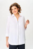 Блузка женская c рубашечным воротником, свободного силуэта. Полочка и спинка изделия, горизонтально разрезные на косую. Верхняя часть полочки с нагрудными вытачками, накладным карманом на левой части и цельнокроеной планкой на застежку. Рукав прямой, втачной с широкой манжетой на отворот. Низ изделия фигурный с разрезами по боковым швам, обработан широкой обтачкой.