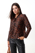 Блузка свободного кроя с цельнокроеным рукавом, воротник со стойкой. Рукав длинной ниже локтя с широкой манжетой на застежку петли - пуговицы. Спинка блузки стачная по среднему шву с обработанным разрезом на застежку пуговицу. Низ собран на эластичную ленту.