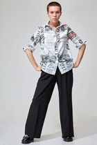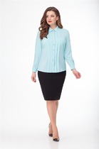 Женская блузка с V-образным вырезом. Модель c воротником стойкой. Рукав втачной длинной за локоть и шнуровкой-стяжкой. Передние полочки блузы с нагрудными вытачками. По спинке планка с застежкой на пуговицы.